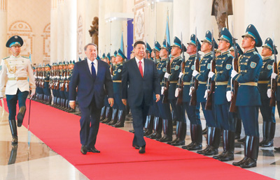 6月8日,国家主席习近平在阿斯塔纳同哈萨克斯坦总统纳扎尔巴耶夫举行会谈。会谈前,习近平出席纳扎尔巴耶夫在总统府举行的隆重欢迎仪式。 本报阿斯塔纳6月8日电(记者吴焰、杜尚泽、周翰博)国家主席习近平...