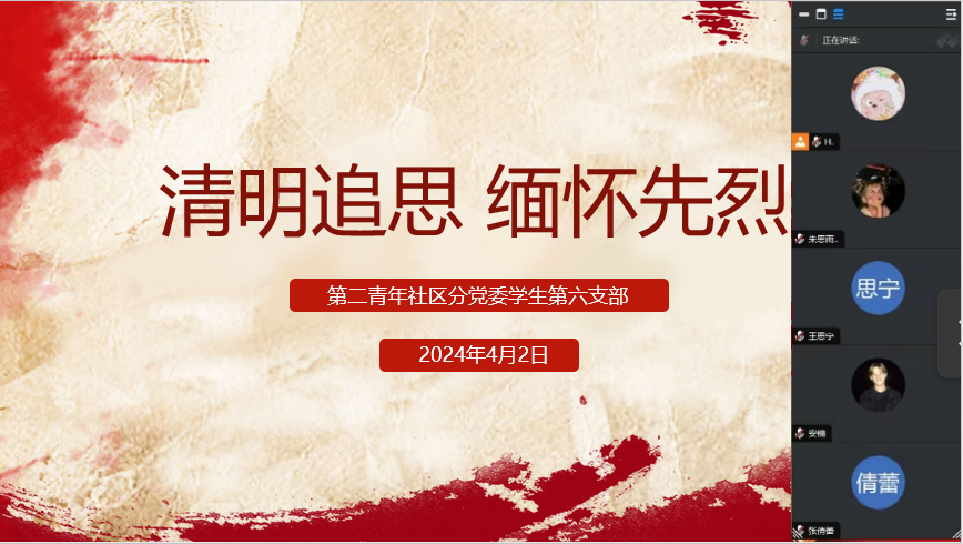 为了缅怀革命先烈,引导青年学生继承和弘扬英烈精神,发扬革命优良传统,宣扬爱国主义精神。第二青年社区分党委学生第六支部于4月2日组织学生们开展线上祭奠先烈活动。同学们通过回忆先烈们的英勇事迹,发表感言等方式进行网上祭奠活动,表达了对先烈们的无限敬仰和深切缅怀之情,进一步增强了同学们的历史责任感和使命感。通过此次活动,同学们深切地感受到了英雄烈士精神的时代价值和现实意义,对于弘扬革命精神,永葆先进本色有了更加深刻的认识。...