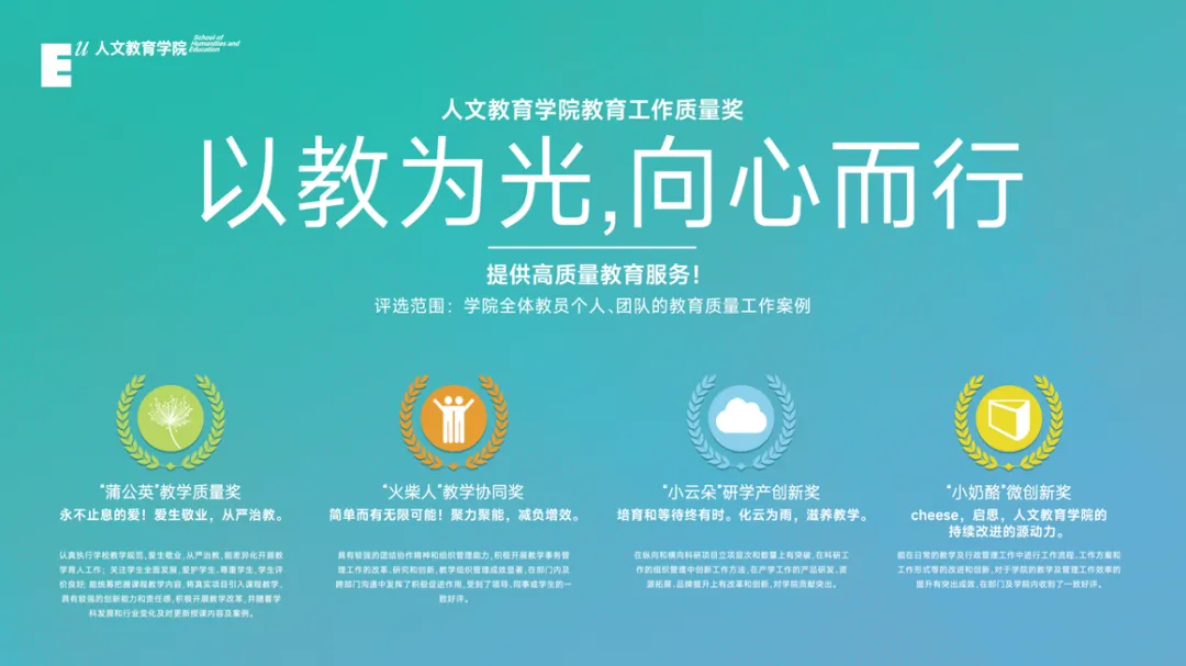 9月10日下午,在第41个教师节到来之际,人文教育学院以“以教为光,向心而行”为主题,举行2025年教育工作质量奖表彰大会,表彰在过去的一学年中,在教育教学、协同管理、研学创新等方面涌现出的优秀个人与团队,进一步激发全院教职工投身高质量教育服务的热情,凝聚全院力量推进师范专业建设再上新台阶。“蒲公英”:坚守教学初心,深耕课堂质量“蒲公英”教学质量奖以“永不止息的爱!爱生敬业,从严治教”为理念,表彰在教学规范、...