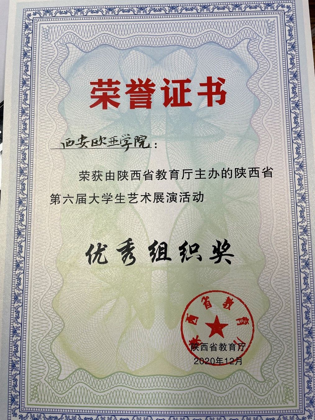 2020年 校团委荣获陕西省第六届大学生艺术展演优秀组织奖