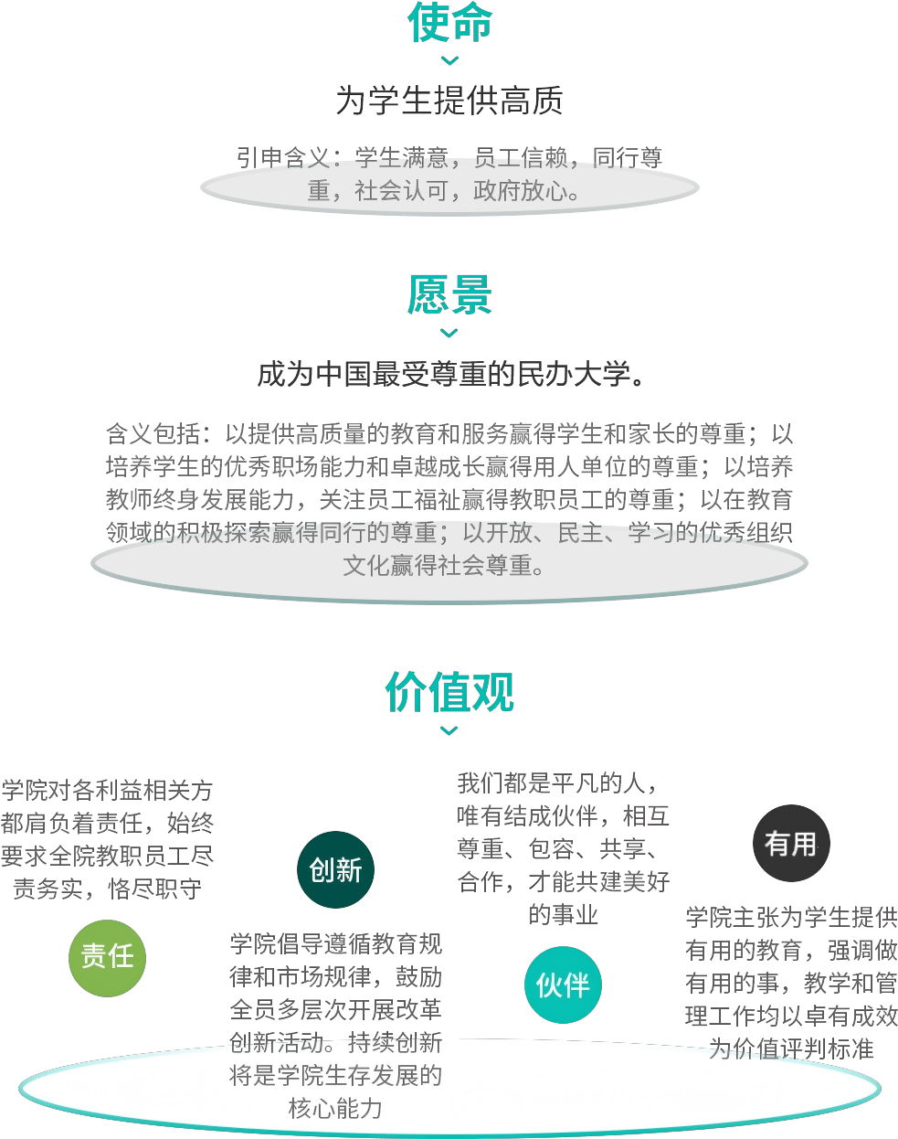 董事会在充分听取广大教职员工意见的基础上,制定了学院的使命、愿景和核心价值观。