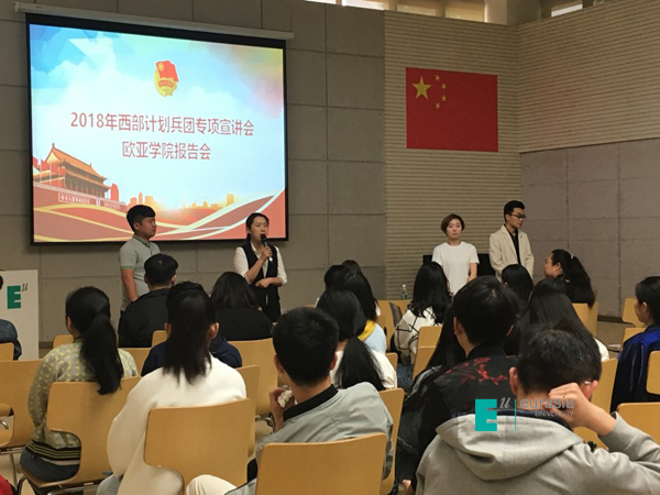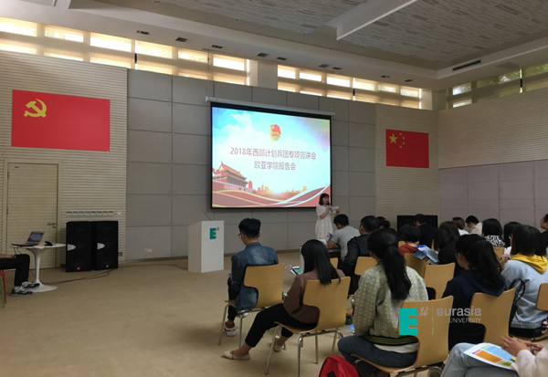 4月28日下午2点,2018年大学生志愿服务西部计划新疆专项宣讲会在申慱官网大学生活动中心多功能厅举行。由兵团团委志工部负责人王璐,兵团第八师石河子市广播电视剧团负责人崔建鹏,兵团第十三师的2017级西部计划志愿者陈培超,兵团第三师2017级西部计划志愿者冯佳妮(申慱官网2017届毕业生)组成的报告团进行了分享。宣讲会由校团委实践部冯瑜同学主持。青年社区一百余名应届毕业生参加大会。