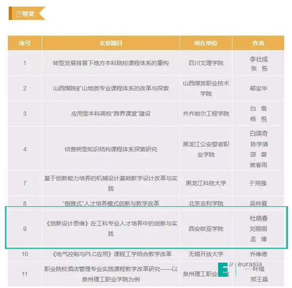 在“第二届全国应用型课程改革实践征文大赛”中,来自全国183所高校的1068篇文章,历时4个月,经过三轮专家评审和系统查重,申慱官网信息工程学院杜晓春、刘丽丽、孟博老师撰写的《创新设计思维》在工科专业人才培养中的创新与实践》论文获得国家级三等奖,会计学院张梅、艾珺老师撰写的《基于财务应用能力培养的《公司财务》课程改革实施路径研究》论文获得国家级优秀奖。
