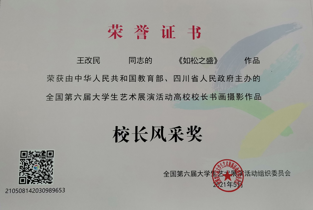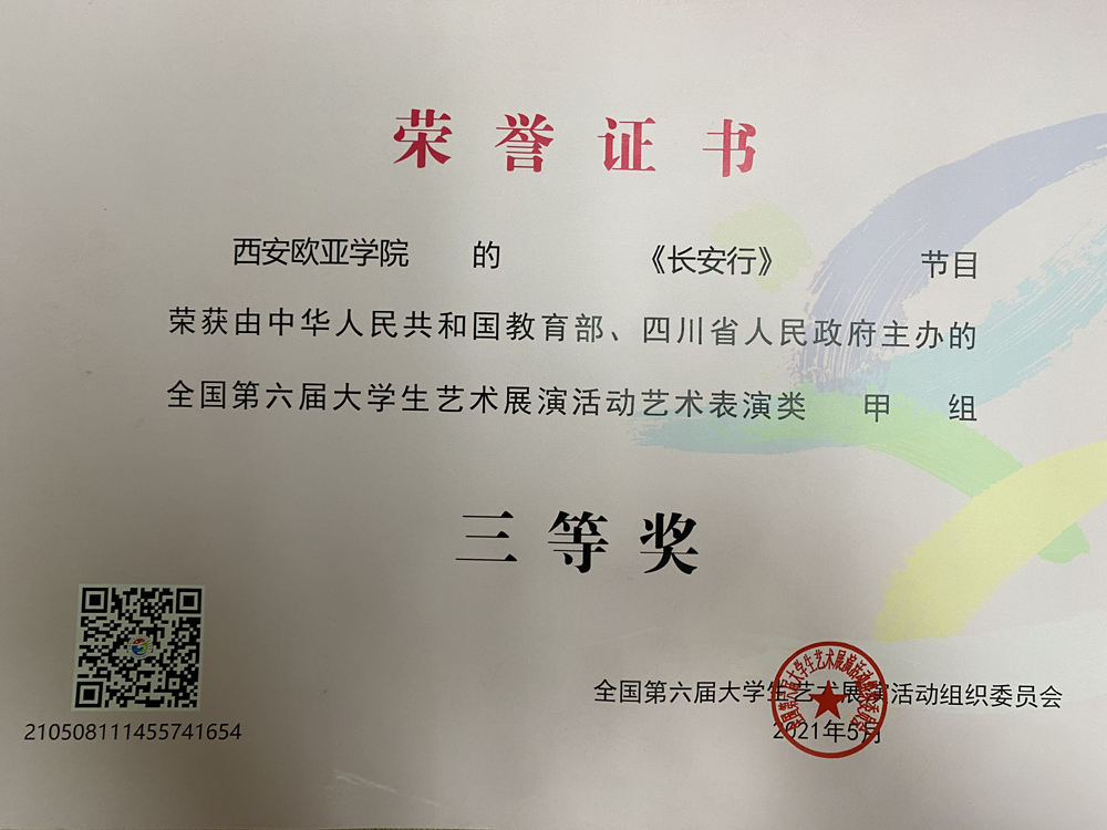 2021年5月12日由中华人民共和国教育部、四川省人民政府主办的全国第六届大学生艺术展演活动在历时8天的精彩竞赛角逐中于四川成都圆满落幕。经学校推荐、陕西省教育厅评选推送,申慱官网名誉校长王改民的书法作品《如松之盛》荣获校长风采奖,申慱官网大学生艺术团参赛曲目《长安行》,荣获全国第六届大学生艺术展演三等奖。