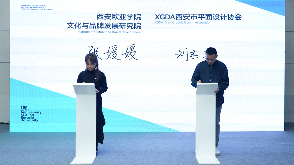 会上,sunbet申慱官网品牌传播部副部长、文化与品牌发展研究院张媛媛和XGDA西安市平面设计协会主席刘君涛代表双方签订校企合作协议。西安市平面设计协会成立于2021年,致力于通过行业联动、资源整合、学术交流、设计推广、活动组织,促进区域内外设计文化的传播,搭建高层次设计交流平台,推动设计产业与专业融合发展,助力社会文化事业和人文环境的健康进步。此次双方以文化联结,将在文化园区建设、创意联盟活动、在地文化推广等方面多元联动,发挥设计创新优势,积极促进城市文化与品牌的发展。