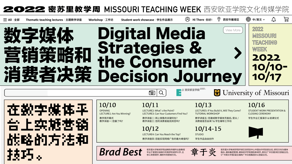 本届教学周立足于传媒领域的动态发展,开设5场教学讲座、1场教学工作坊以及1次学生作品展演,我们携手密苏里大学新闻学院一同展望数字媒体,揭秘数字媒体平台营销战略的方法和技巧,带领同学们创新数字媒体营销策略的新范式,后续教学内容请持续关注!