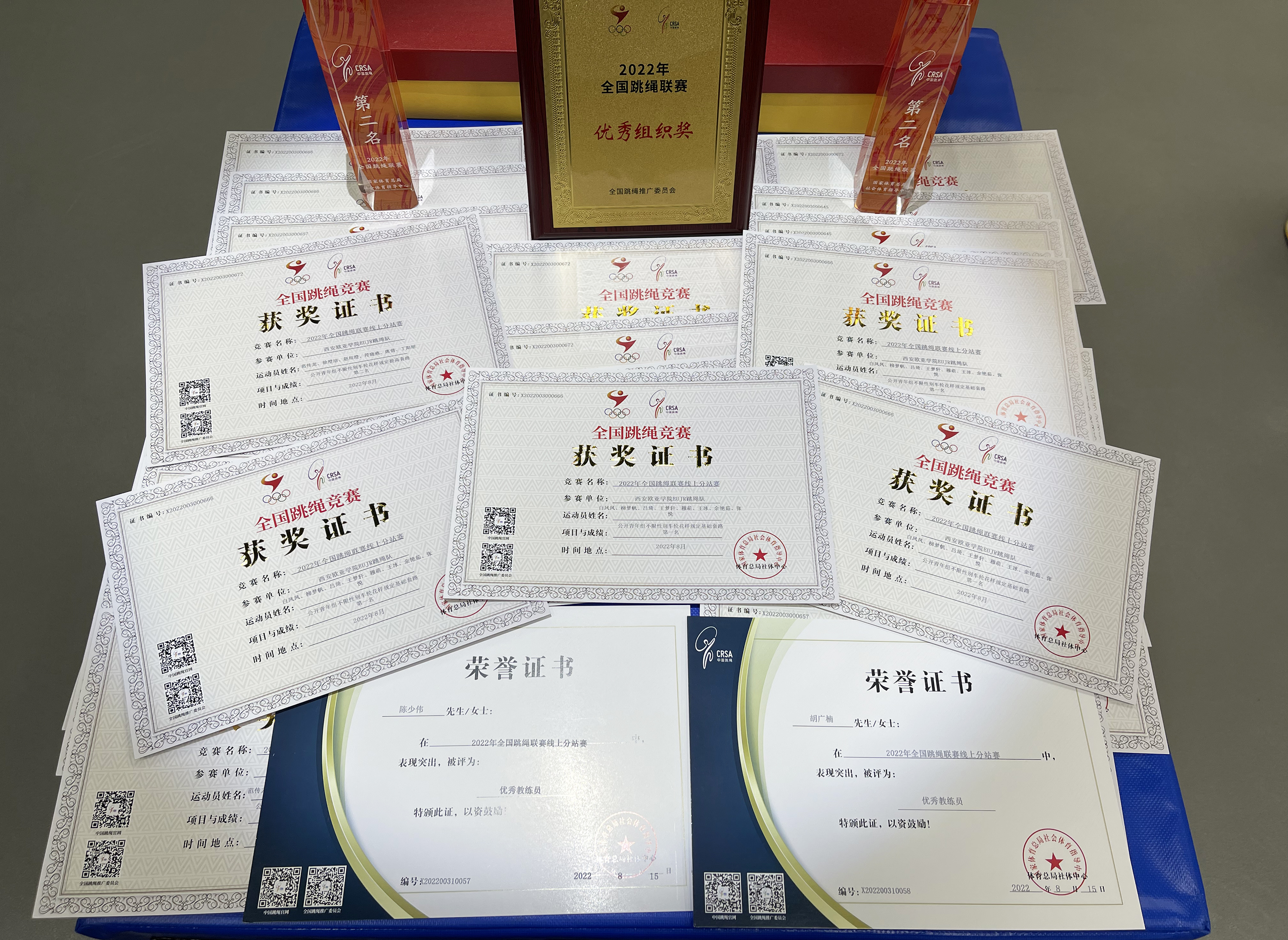 近日,2022年全国跳绳联赛线上分站赛发布成绩公告,申慱官网EUJR跳绳队在个人花样集体、车轮花样集体等多个单项斩获1项冠军、2项亚军、1项第四名的佳绩,并荣获全国跳绳联赛“优秀组织奖”。