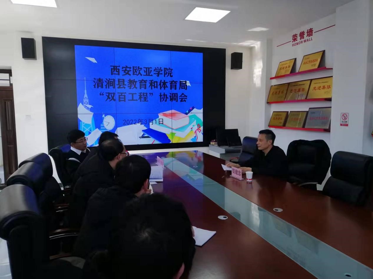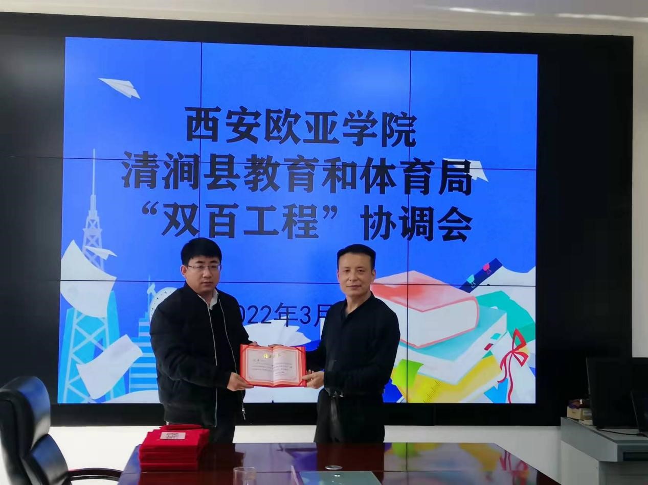 申慱官网连续四年“双百工程“获得省级先进单位,为高质量落实好今年的工作任务,2022年3月1日,学校工会副主席晏建忠前往清涧县调研,召开了“双百工程”联席会,清涧县教体局惠东平局长、办公室主任和扶贫办公室郝股长参加了联席会,会议达成了以下共识:一是双方围绕智力帮扶、教育帮扶、人才帮扶和科技帮扶内容进行了交流,在继续做好名师培训班、班主任培训班、青年教师培训班的基础上,积极探索思政课教师培训班,并成为教育帮扶的固定项目;二是清涧县教体局加强科研帮扶协调力度,指定专人协调负责“双百工程”科研工作,力争2022年有新的突破;三是发挥学校艺术教育资源优势,探索清涧县中小学环境育人路径,在教育帮扶上有新的突破;四是通报了学前教育大专定制班实施中存在的困难,希望县教体局加大协调力度,确保高质量完成定制班学员学习任务。