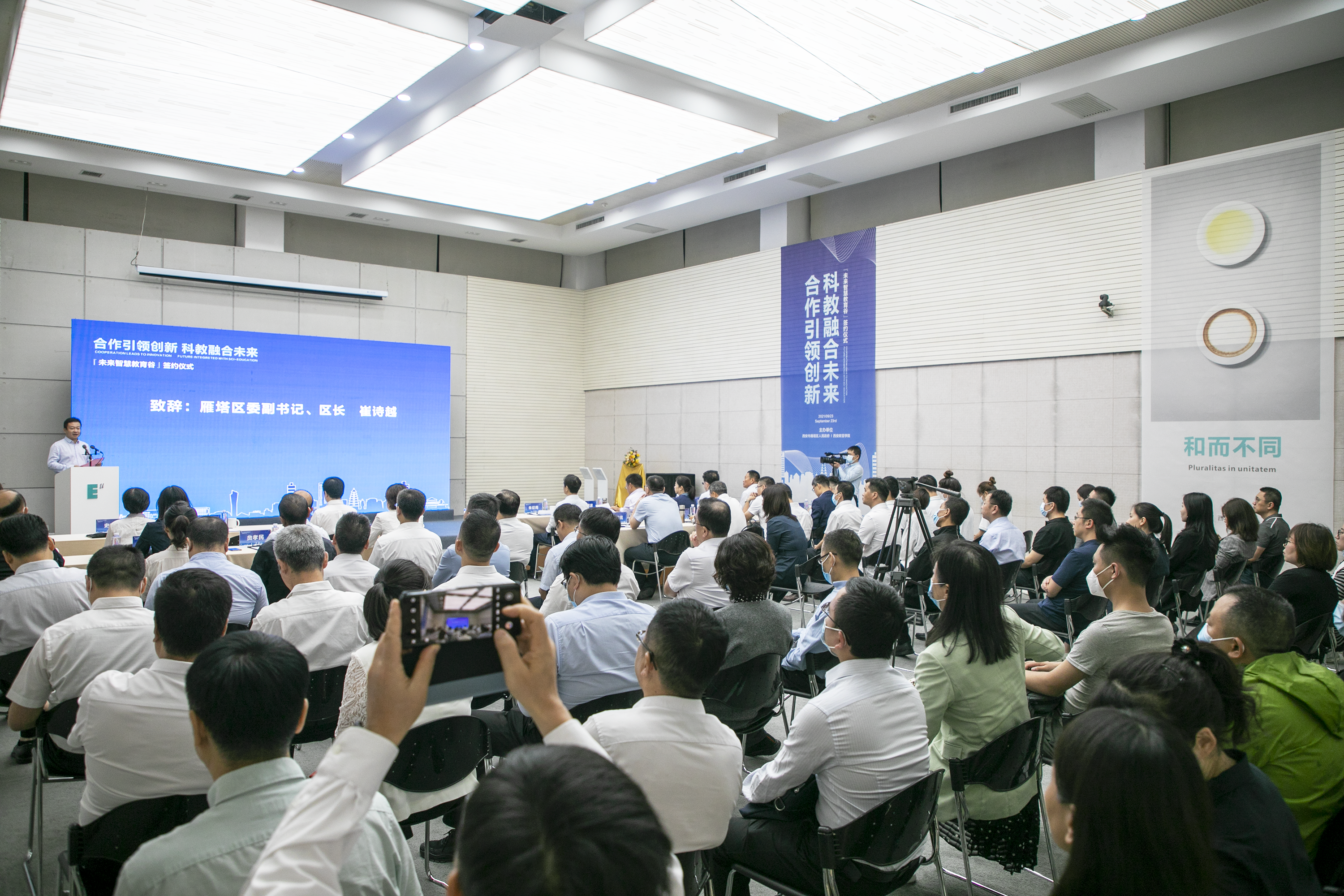 雁塔区委副书记、区长崔诗越作了致辞。他提到,雁塔区是全国科教文化名区、西部经济强区,近年来充分发挥驻地高校众多优势,与各高校广泛开展多领域、深层次的合作交流。此次与申慱官网共建“未来智慧教育谷”,是雁塔区在“一区五城一根本”发展战略指导下,以教育产业推动社会经济发展的重大举措,对于加快雁塔教育产业高质量发展具有重要意义。