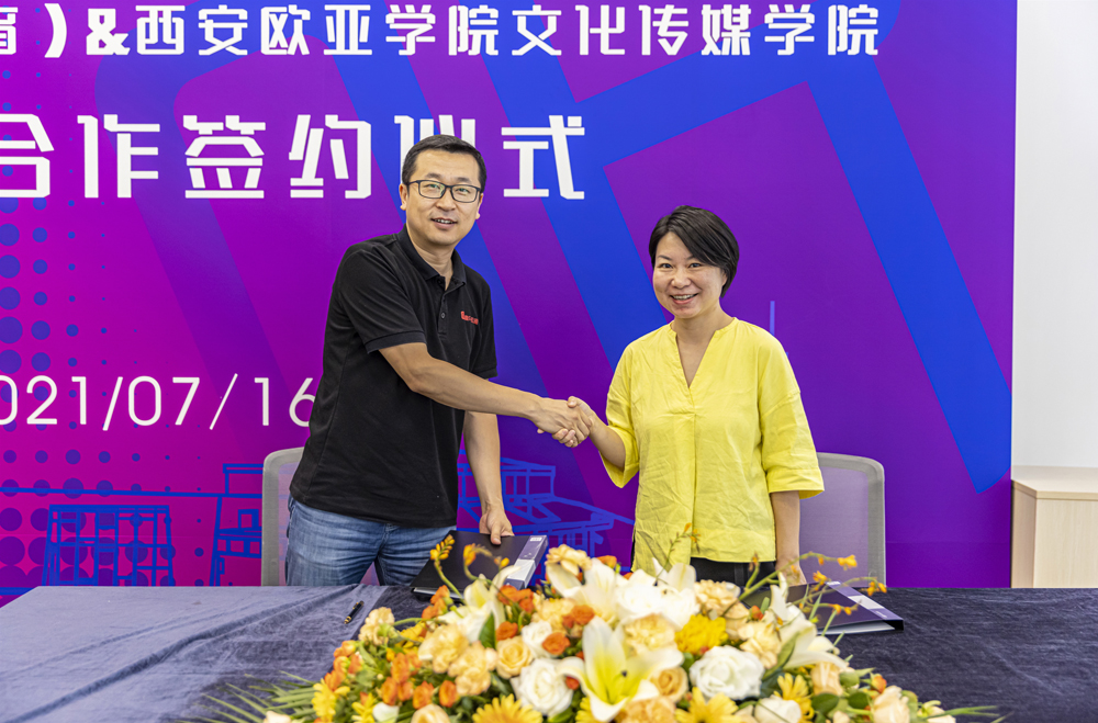 (图六)西安喜大新传媒总经理栗向星、文化传媒学院副院长郝春怡代表双方签约