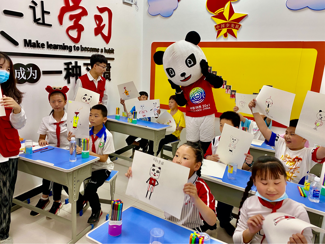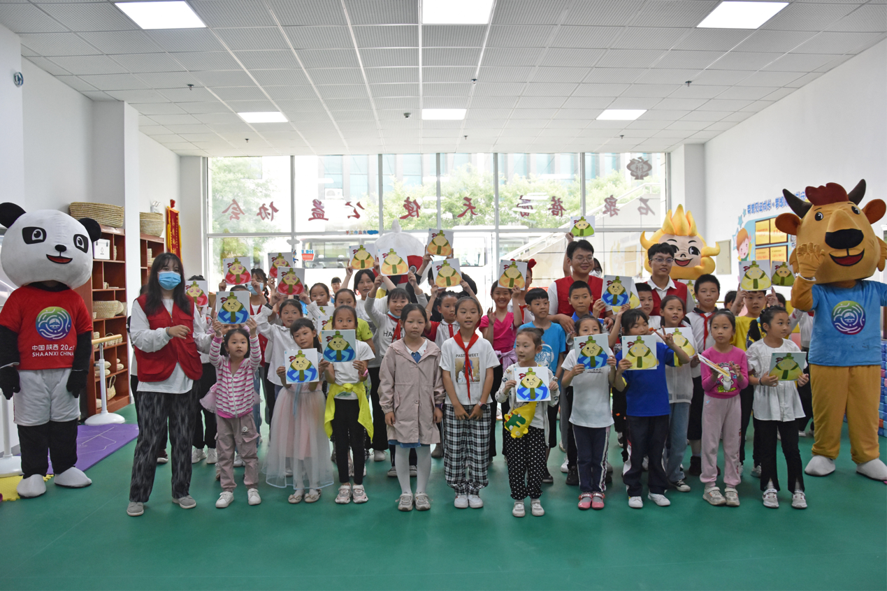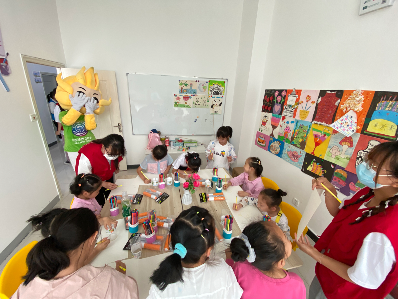 校青协的志愿者向小朋友们介绍了有关十四届全运会相关知识。在小朋友与志愿者们的欢声笑语中,小朋友们用画笔记录下了与四个吉祥物的美好时光。