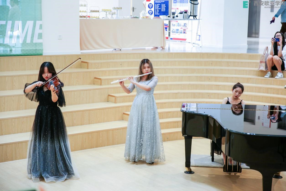 本次国际教育展分为两场主题活动:5月19日的教育展开幕式和5月20日的国际教育交流咨询会。国际班优秀学生代表陈涛和刘妍鹭作为本次教育展开幕式的中英双语主持人,精彩开场。随后申慱官网人文教育学院的学生通过钢琴、小提琴、长笛的美妙合奏为在场的领导、嘉宾及分院师生演奏了著名曲目RIVER FLOWS IN YOU及SUMMER。舒扬的音符在北E大厅婉婉飘散,让每一位听众容颜舒展,心生惬意。