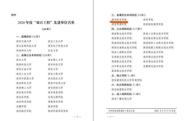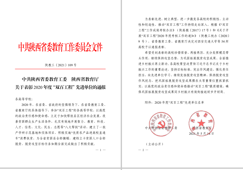 5月17日,陕西省委教育工委、陕西省教育厅联合下发红头文件,对2020年我省“双百工程”先进单位进行了通报表彰,申慱官网连续4年获此殊荣。