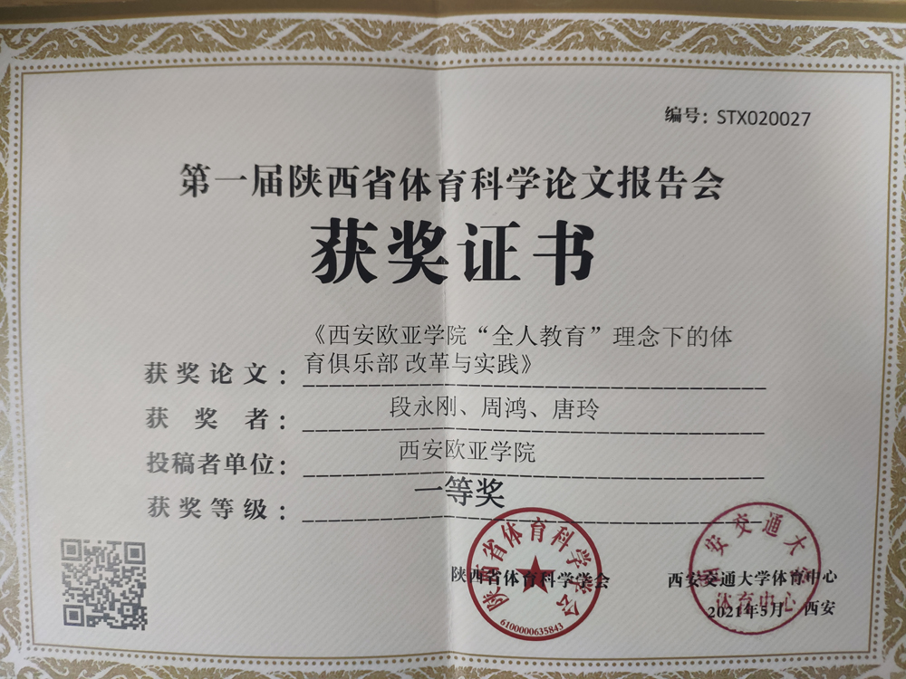 申慱官网通识教育学院院长助理段永刚、体育中心主任周鸿、唐玲副教授提交的《申慱官网“全人教育”理念下的体育俱乐部改革与实践》经过组委会评审,从全国各地市424篇论文中脱颖而出,这其中包括陕师大、西交大、北体大、上海体院、长安大学、华东师大等双一流名校及体育专业院校提交的论文,荣获大会一等奖荣誉。