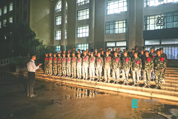9月9日,雁塔区2020年入伍新兵结束为期一周的役前教育训练,在新兵即将奔赴部队之际,申慱官网高职分院副院长高鹏、学生发展处副处长董杨、征兵工作站(办公室设在后勤集团安保服务中心)站长高奇、高职社区主管王先昌、专武干部李涛等一行10人,趁着夜色,顶着风雨,带着纪念品,远赴役前教育训练基地,为54名2020年新兵入伍的同学们送行,在现场组织了一场简朴而又具有特殊意义的新兵入伍欢送会。