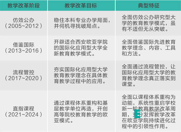 过去10年,在战略转型和组织变革的大背景下,sunbet申慱官网在全校范围掀起的不是战略平稳期的渐进式教学模式迭代,而是战略变革期的颠覆式教学模式再造,并经历了仿效公办、借鉴国际、流程管控和直指课程等4个发展阶段(图5),在以学生为中心的全新教育理念下持续探索、迂回曲折、步步为营、循序渐进,并取得阶段性成功。
