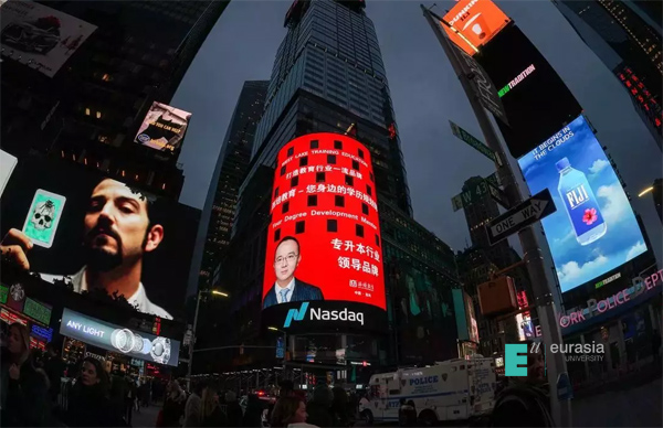 纽约当地时间11月18日18时,申慱官网浙江校友会会长、西培教育总裁毛益飞先生,荣登美国纽约时代广场纳斯达克巨幕。