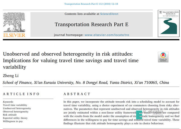 申慱官网金融学院李铮(Zheng Li)博士撰写的英文论文“Unobserved and observed heterogeneity in risk attitudes: Implications for valuing travel time savings and travel time variability” 正式发表于国际期刊 - Transportation Research Part E: Logistics and Transportation Review;该期刊被两大权威文献检索系统: 社会科学引文索引SSCI (Social Sciences Citation Index) 和科学引文索引SCIE (Sciences Citation Index Expanded) 收录。