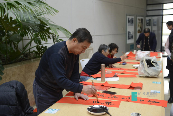 活动现场翰墨飘香,书法家饱含热情,泼墨挥毫,行书、楷书、隶书各显其能,笔走龙蛇,一幅幅精美的春联就呈现在眼前。每一幅精美的对联就是对教职工的每一份祝福,前来领取春联的教职工络绎不绝。领春联的教职工可以自己设定春联内容,也可以从现场提供的近百幅对联中挑选。教职工们手捧着吉祥喜庆的春联,喜悦之情溢于言表,整个图书馆洋溢着新春祥和的气氛。
