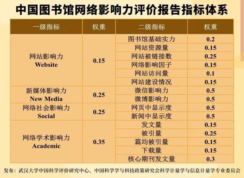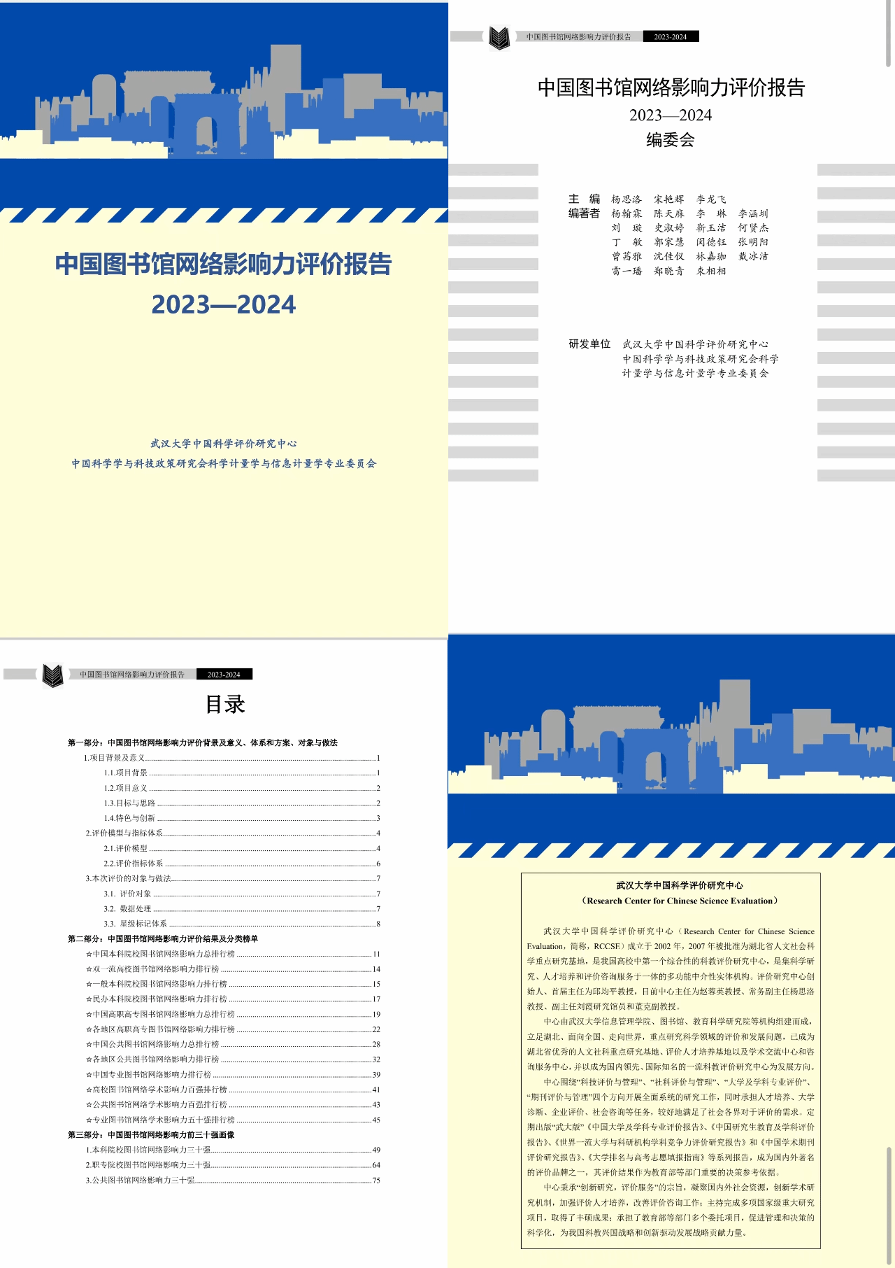 该报告是国内发布的首个图书馆网络影响力评价报告,由武汉大学中国科学评价研究中心和中国科学学与科技政策研究会科学计量学与信息计量学专业委员会联合研发。本报告评价中国图书馆的网络影响力,选取2759所高校图书馆、1488家具有代表性的公共图书馆和66家专业图书馆三大类作为评价对象,包含多级多项指标,较为全面、科学、客观、准确地反映我国图书馆网络影响力。