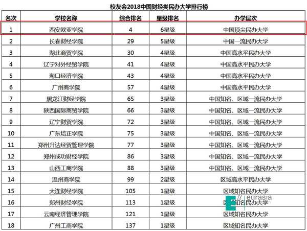 2017年12月25日,艾瑞深中国校友会网最新发布2018中国大学排行榜,申慱官网连续五年蝉联“中国财经类民办大学排行榜”榜首。欧亚还以99.63分的高分位居全国民办大学排行榜第四、陕西第一,同时欧亚也跻身“中国顶尖民办大学”行列。