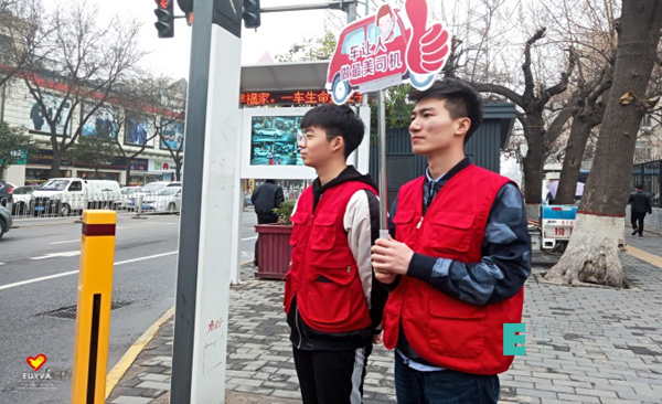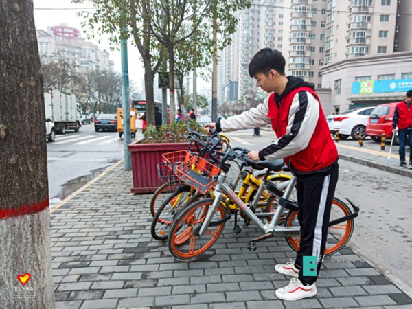 同时,我们的志愿者们在电子正街开展了一系列学雷锋活动,与环卫工人一起打扫卫生,拣拾烟头,整理道路两旁的共享单车,倡导车让人等等。