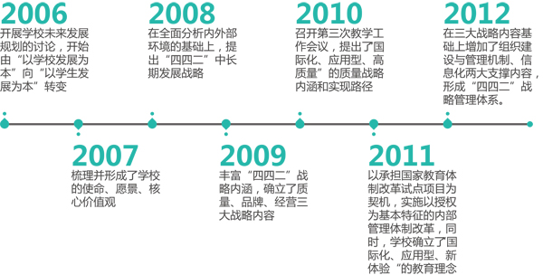 从2008年底到2012年底,“四四二”发展战略就这样在一个简单目标的指引下持续向前推进,在质疑与非议中不断完善,成功地从最初的一个虚无缥缈的十年目标逐渐演变成为一个囊括三大发展阶段、三大战略主题和两大战略支撑,并拥有独特教育质量观和发展观的内涵饱满的战略管理体系。在全新的战略管理体系下,2012年,欧亚学院对“四四二”发展战略进行了全面优化。