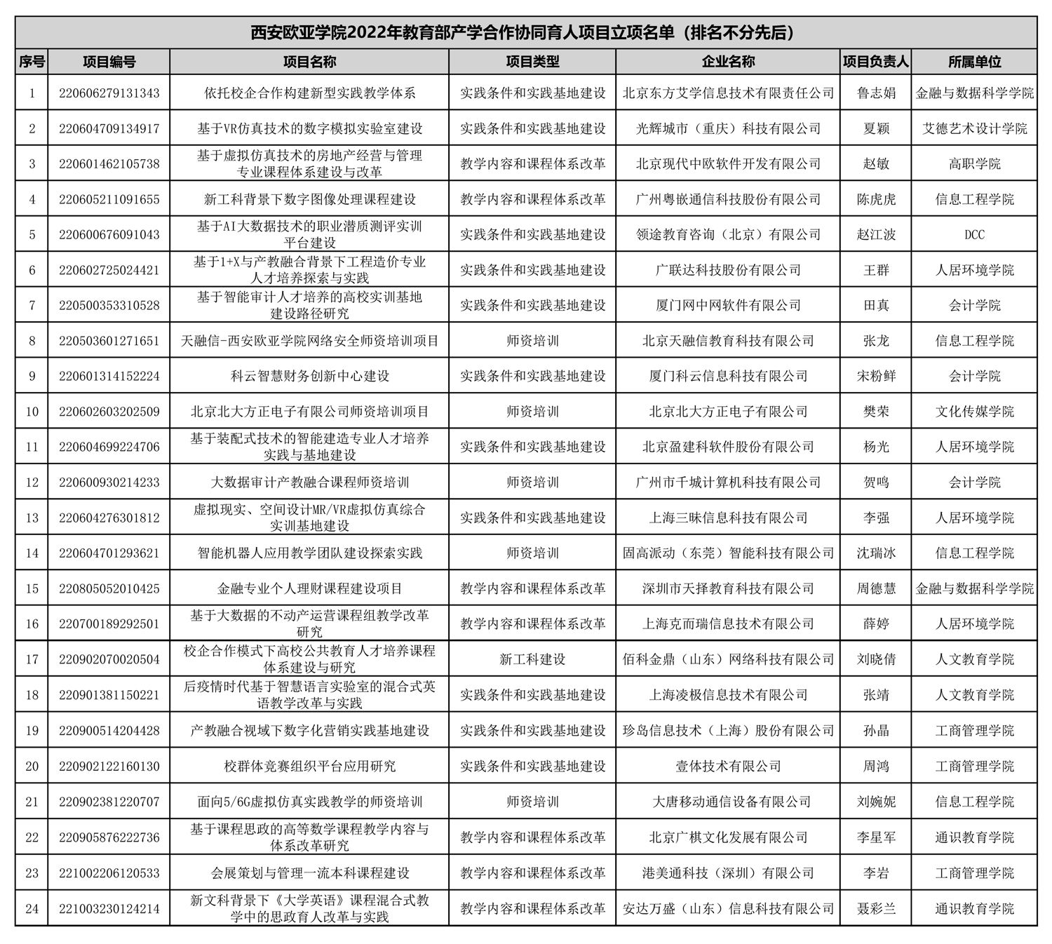 近日,教育部高等教育司公布了2022年产学合作协同育人项目立项名单,申慱官网24个项目获批立项。自2016年申报项目以来,欧亚累计获批教育部产学合作协同育人项目93项。