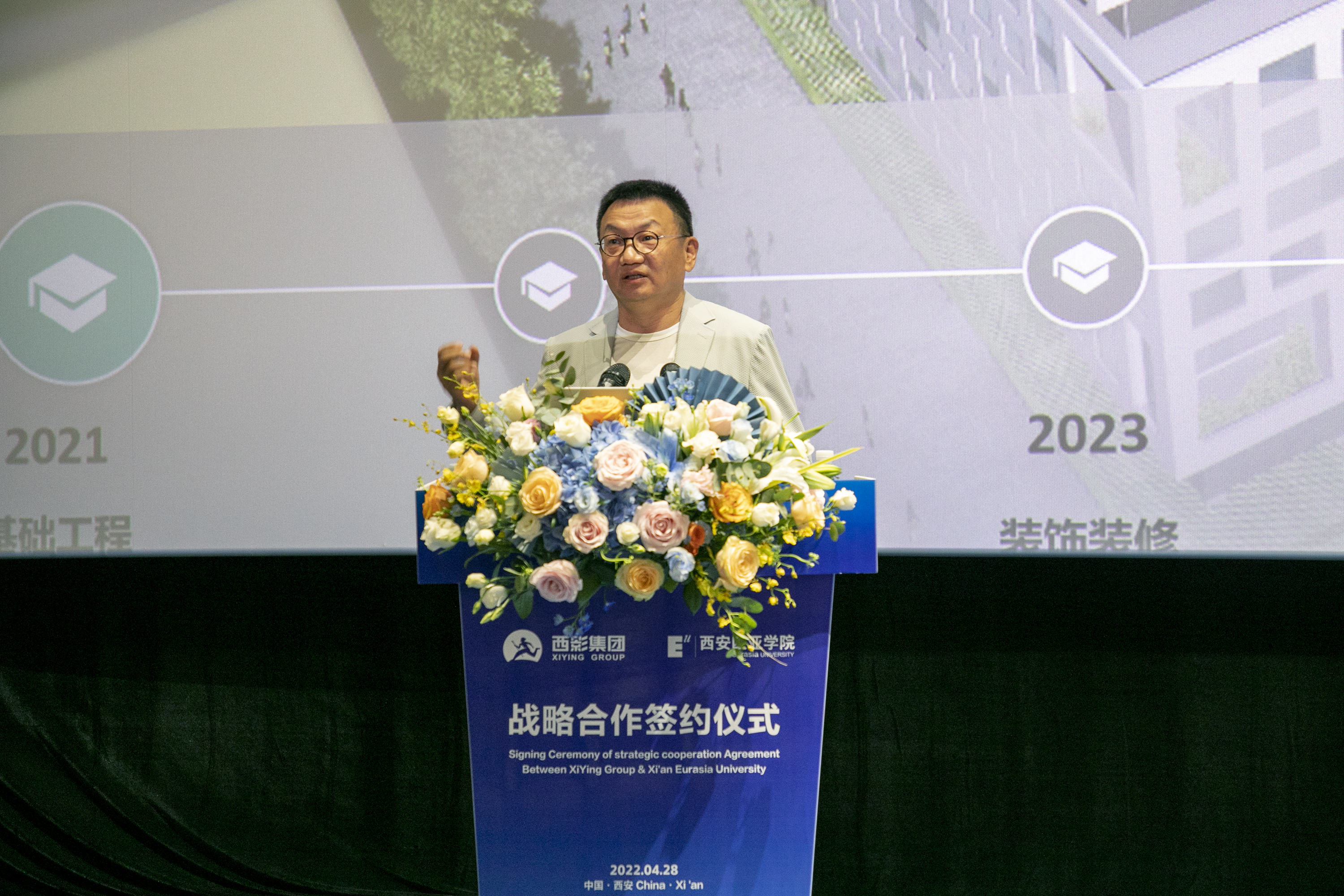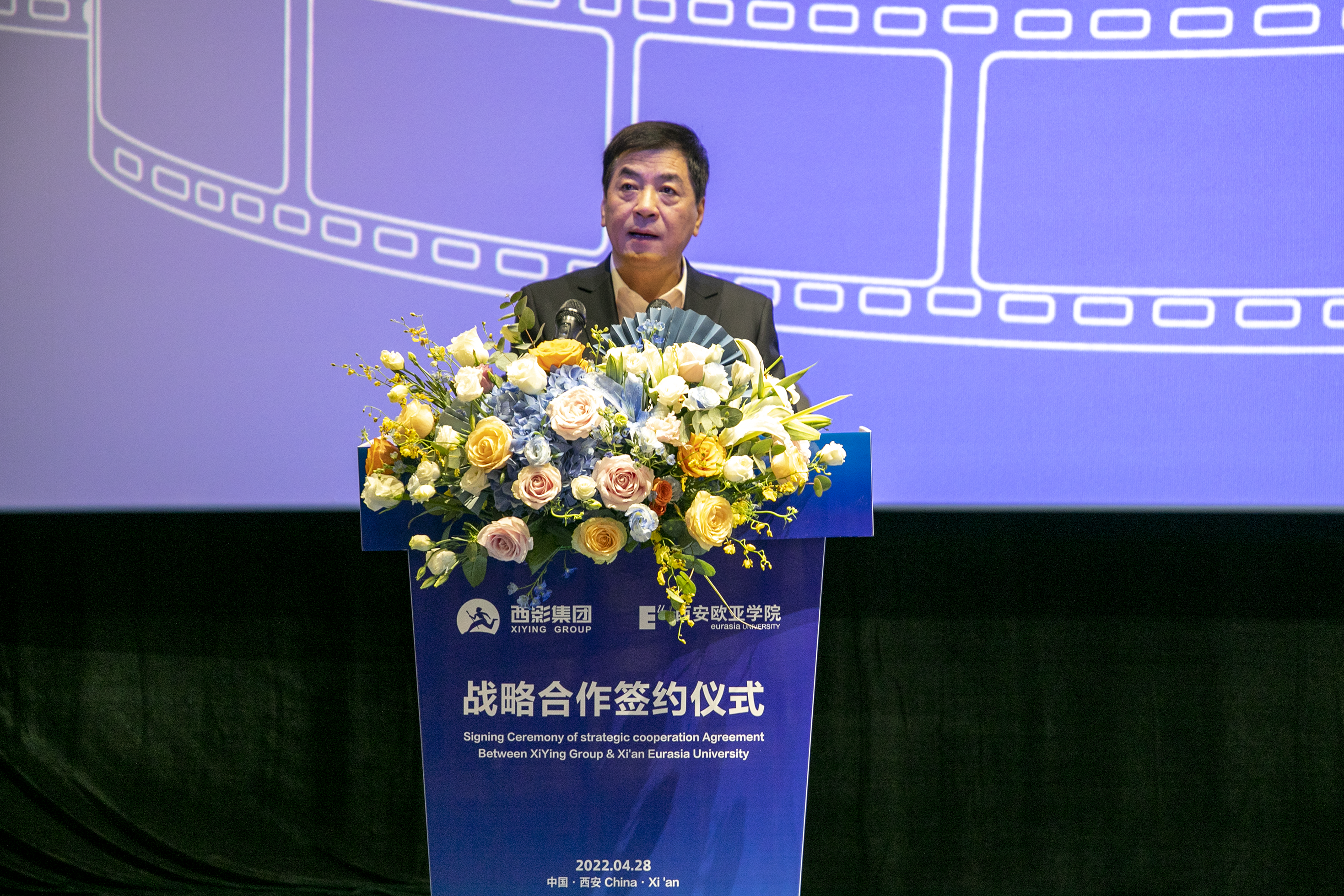 仪式现场,胡建波教授结合自身对于企业管理经营的思考和实践,与大家分享了主题为“机会-战略-使命:申慱官网战略转型之路”的专题报告。他通过讲述申慱官网的发展历程、转型改革、使命愿景、“十四五”发展规划等方面内容,展现了欧亚从机会驱动到战略驱动,再到使命驱动的转型之路。胡建波表示,欧亚将与西影结为伙伴,陪伴式成长,共同提升组织核心能力,推动战略转型。