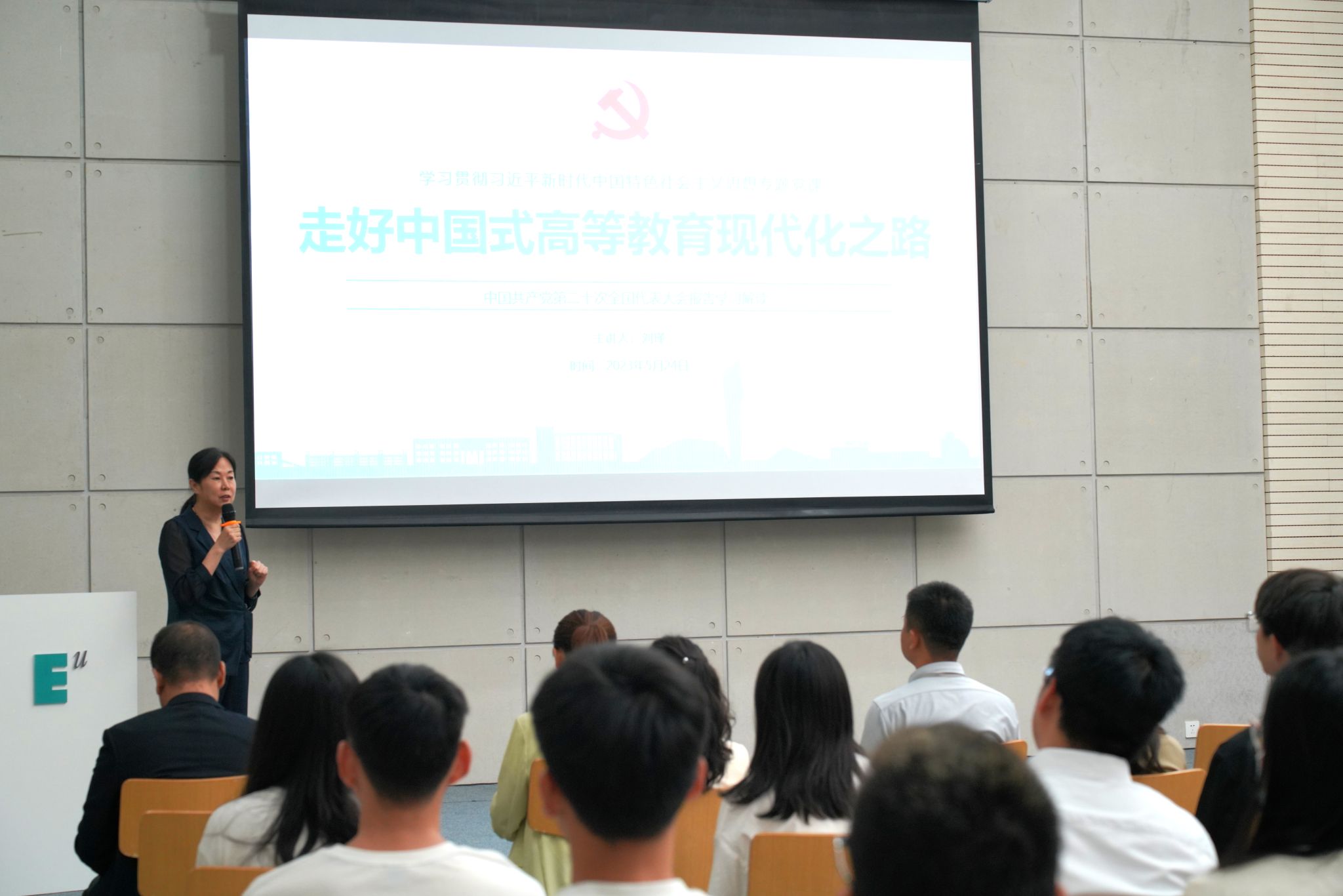 5月24日上午,申慱官网党委副书记、校长刘瑾同志代表学校深入开展学习贯彻习近平新时代中国特色社会主义思想主题教育专题宣讲团,在大学生活动中心多功能厅为师生们带来了一堂生动的主题教育专题党课。本次党课的主题为“走好中国式高等教育现代化之路”,第四青年社区分党委的全体师生党员和入党积极分子共82人现场聆听了这场专题党课。