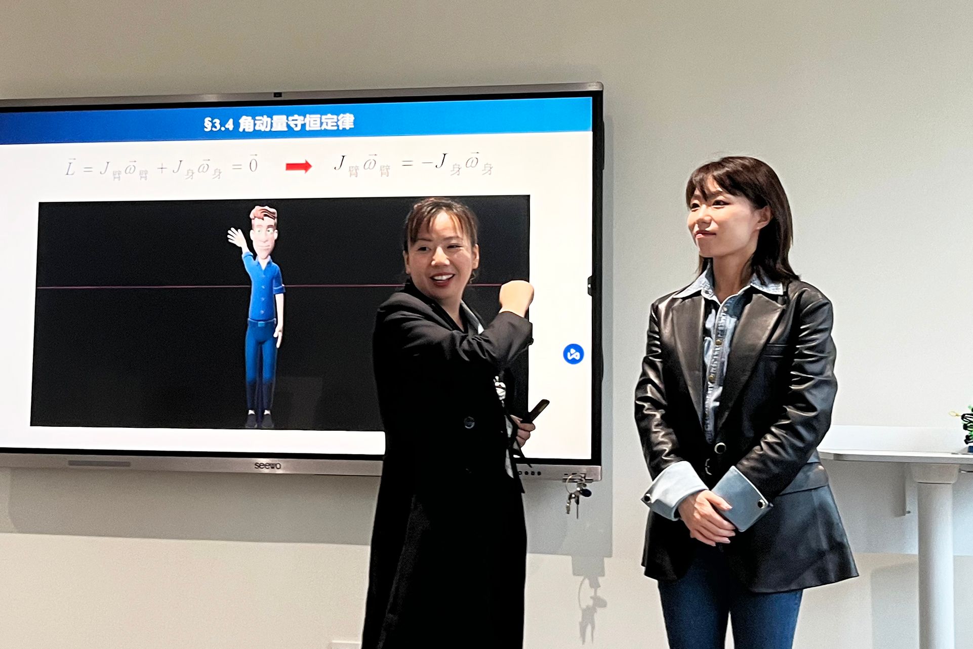 张锦副教授承担《大学物理》等课程教学研究。她展示的主题为“角动量守恒定律”。在“格物致知,透过现象看本质”的框架中,她由载人航天视频引入,让学生顺着航天员的脚步,走入空间站;借由航天员转身时的姿态,于层层设问中引导学生理解物理公式。在“胳膊与身体转动圈数对应关系”的设问中,通过物理建模得出结论,又回放视频验证结论,将课程素材充分挖掘。特别值得一提的是,张锦老师在授课中使用了一个造型奇妙的伸缩球,用以展示收缩和扩张下转速的变化,这个取材于孩子玩具并加以改造后的装置,成为了她的教学利器。“通过角动量,大家算算40亿年后一个月有多少天?”课下任务发布后,张锦老师以“赴九天,问苍穹,我们的征途是星辰大海”收尾,将一个简单的物理知识推向了实践应用和国家发展的新高度,整个展示过程引发了基础课程教师对“课程思政”设计的思考。