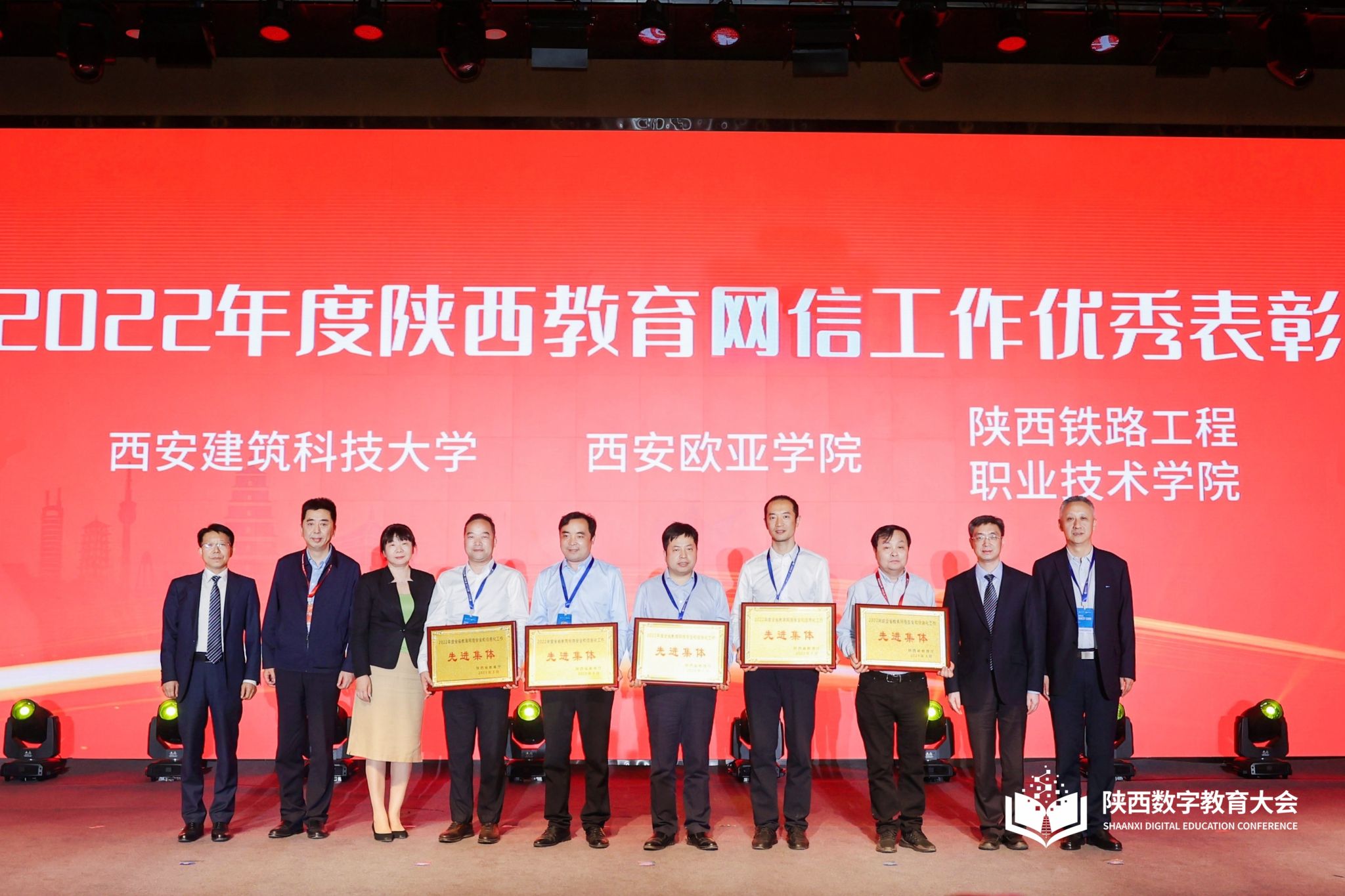数字教育大会现场进行了2022年度陕西教育网信工作先进表彰,申慱官网图文信息中心再次荣获全省教育网络安全和信息化工作先进集体,这已是申慱官网连续第五年获评该项荣誉称号,图文信息中心主任罗征登台领奖。