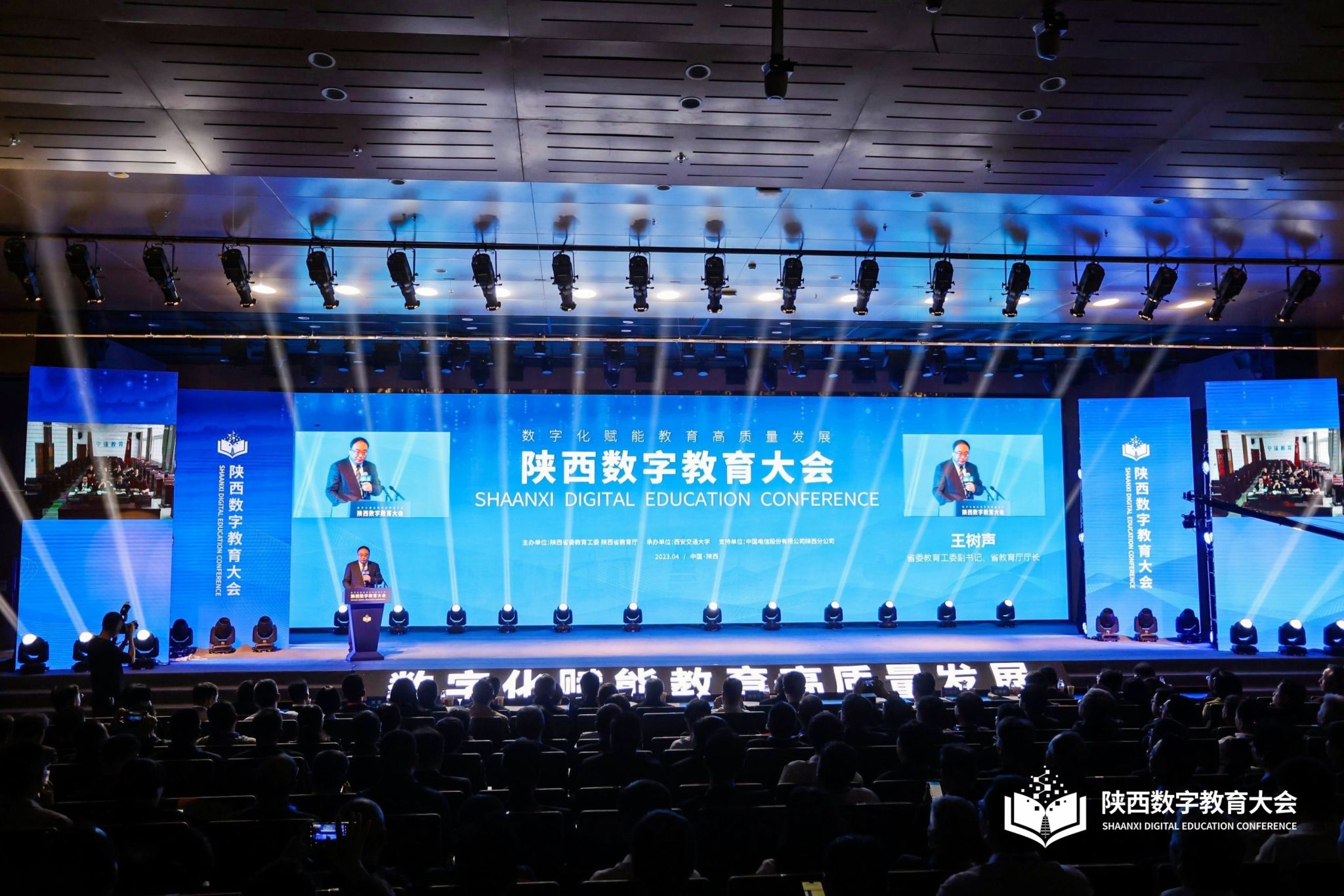 2023年4月20日,“陕西数字教育大会”在西安交通大学创新港校区召开,会议由陕西省委教育工委、省教育厅主办,会议以“数字化赋能教育高质量发展”为主题,通过围绕数字教育的交流研讨,落实国家教育数字化战略行动,营造数字化立德树人环境,全面推进陕西数字教育发展。教育部科技与信息化司副司长舒华、西安交通大学校长王树国出席会议并致辞。省委教育工委副书记、省教育厅厅长王树声主持会议。sunbet申慱官网创办人、董事长胡建波,副校长李正受邀参加本次大会,在数字教育论坛环节,胡建波董事长出席并发表了讲话。