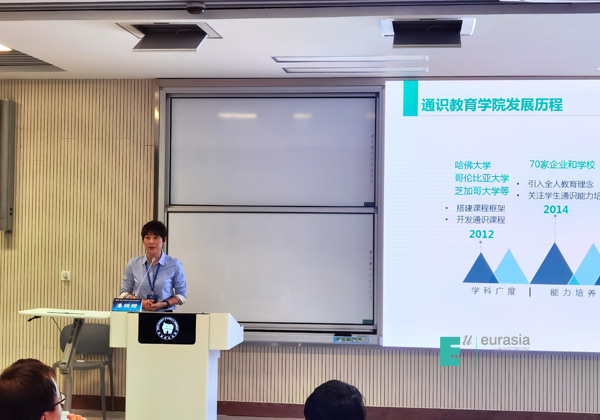 通识教育学院院长助理潘珊珊老师首先发言,向参会老师介绍了欧亚学院通识教育学院的组织部门构成和发展历程。接下来系统地介绍了通识教育学院的人才培养体系和课程体系建设历程,从标杆院校到企业人才需求的调研,从知识结构到思维习惯。在新的课程体系重构的背景下,为了让通识人才目标有力地支撑校级人才培养目标,新一轮的课程改革逐步推进,课程管理机制改革,课程设计与实施的过程也更加科学。