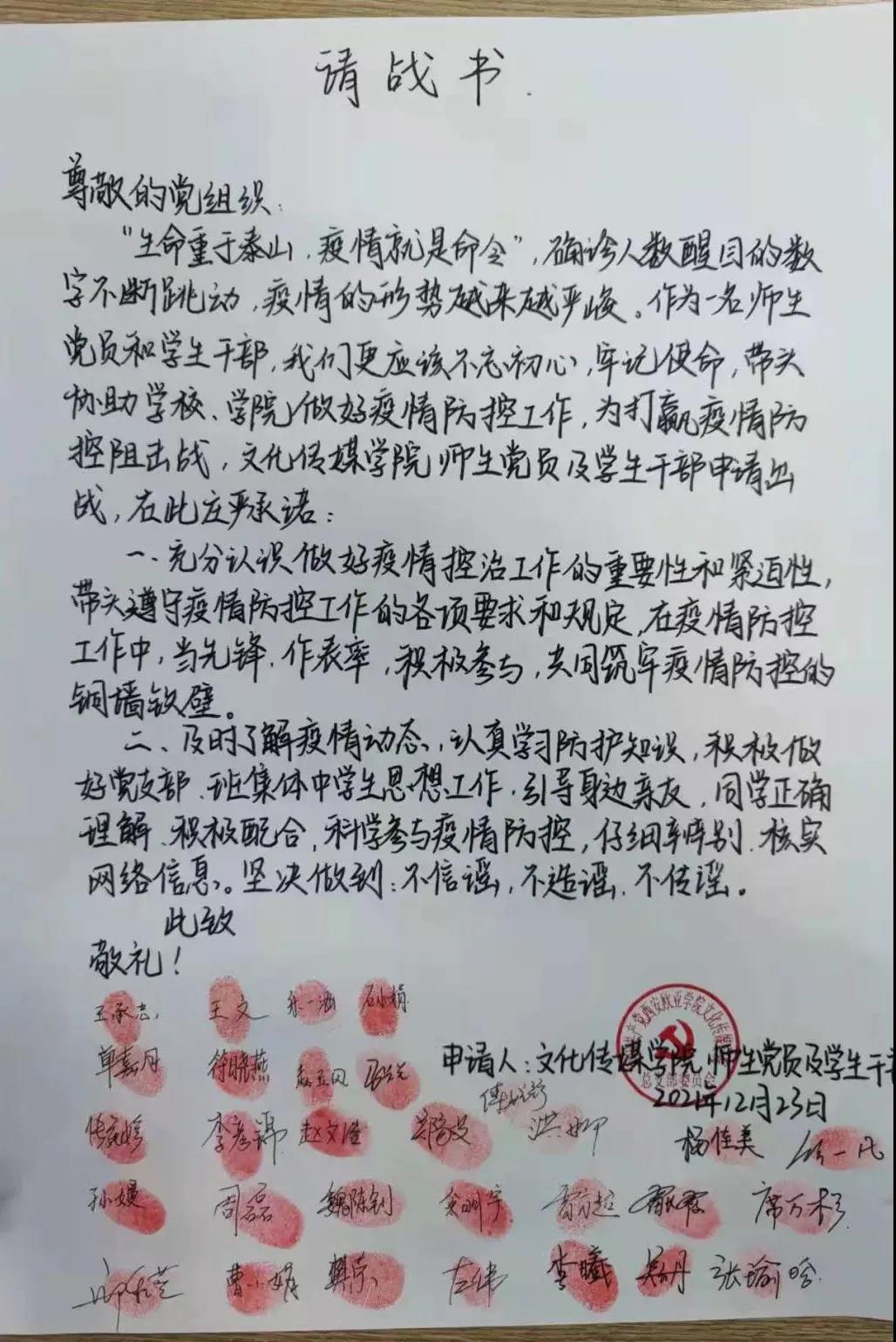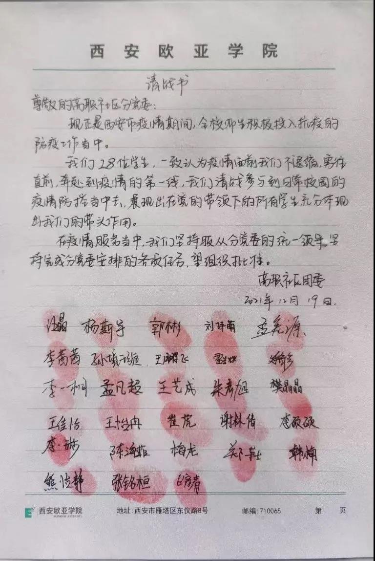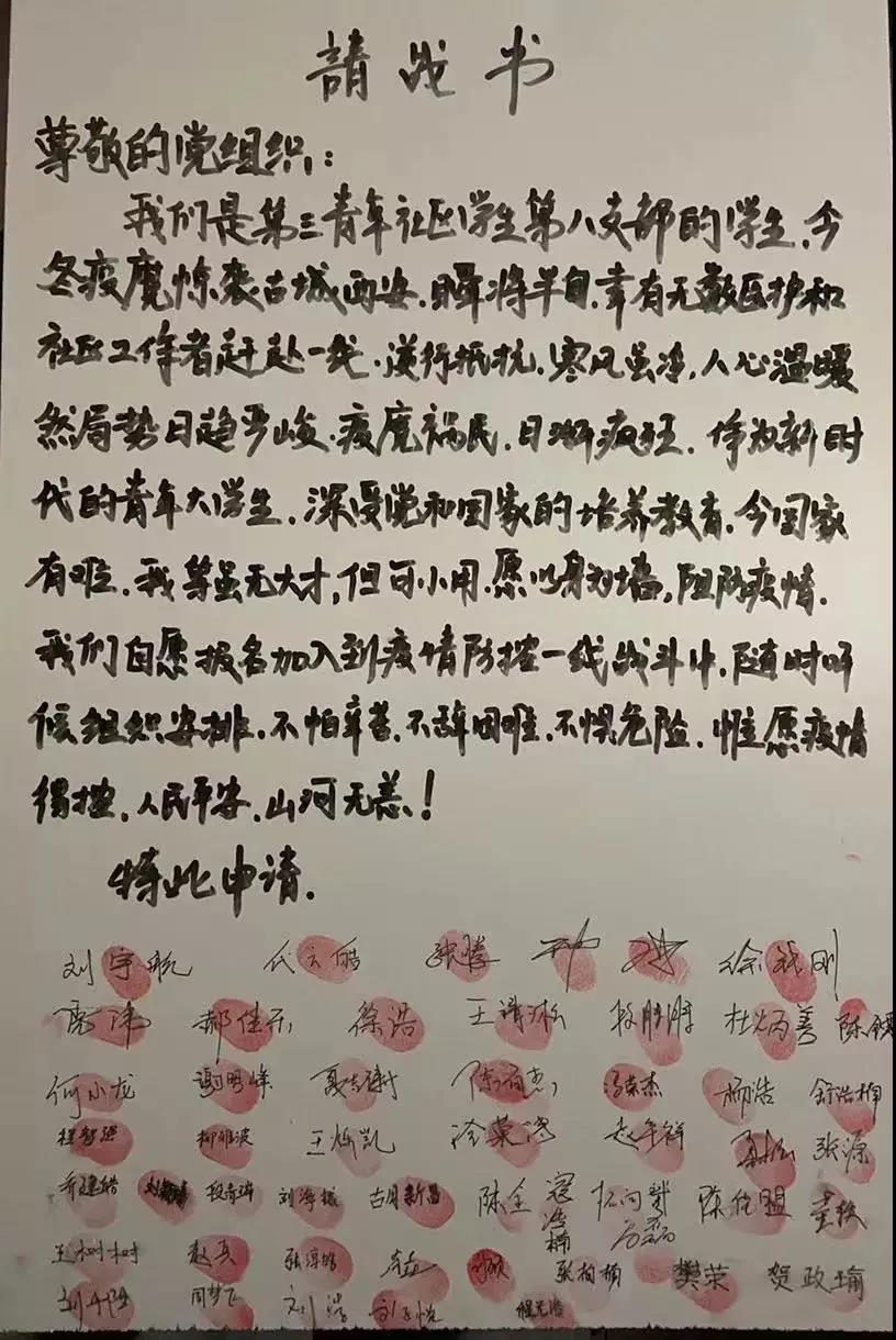 “尊敬的党组织,我自愿报名,申请加入疫情防控工作,筑牢疫情防控的‘铜墙铁壁’……”学生党员们响应号召,积极投身校园疫情防控服务。他们的身影出现在每一个楼层,保证每一次核酸组织有序、无一人遗漏,用实际行动彰显青年担当。