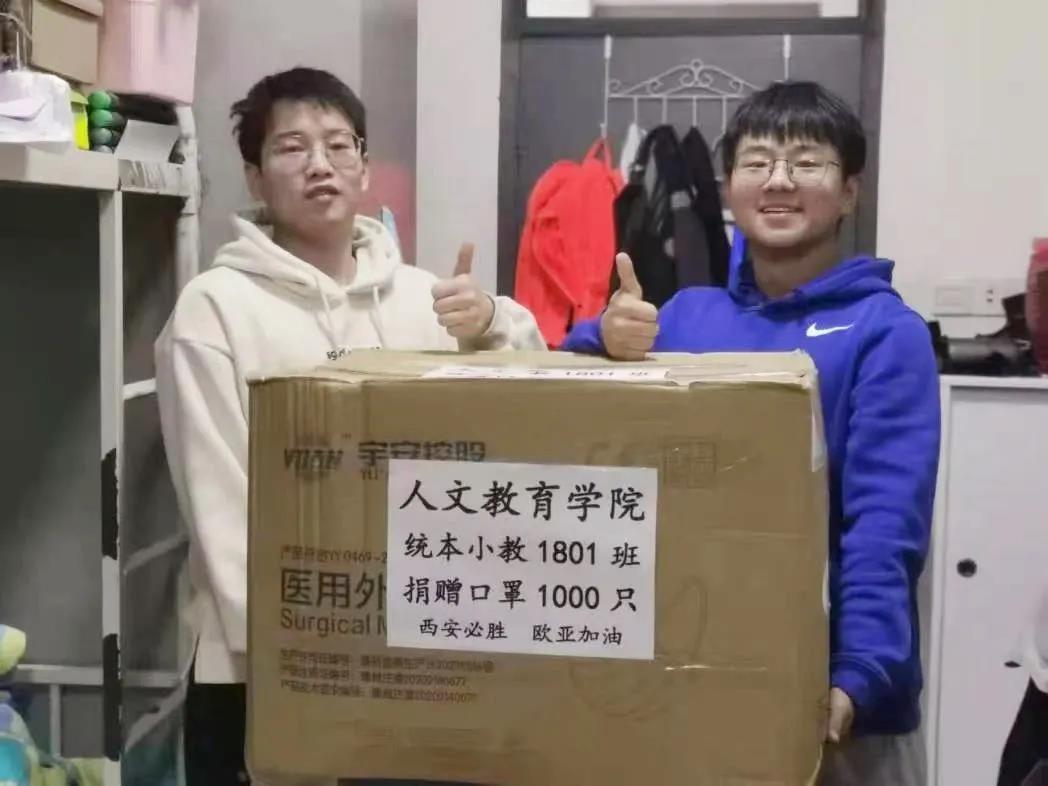 在小学教育专业1801班班长段青瑞提出倡议后, “可以!”“可以有!”“我觉得可以!”一声声坚定的支持瞬间刷屏了班级群聊。他们最终将奖学金用于支持防疫工作,购买了2000只口罩,捐赠给后勤集团和65个宿舍,为校园安全贡献了自己的绵薄之力。