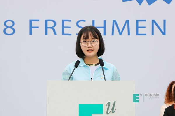 通识教育学院黄鑫代表全体教师致欢迎词,首先,他对同学们的到来表示欢迎。随后,他指出,求学的真正目的,不是为了迎合时代的潮流,而是应当能够安静下来,去寻找、发现这个世界的真理和智慧,能够有勇气和毅力,去探索、欣赏这个世界的美和善意,并且在这个过程中,遵从自己的内心,从容而笃定。他希望,每一名同学都能够在欧亚学院,去感受去追寻这样一份真实,让真实成为心中的光。