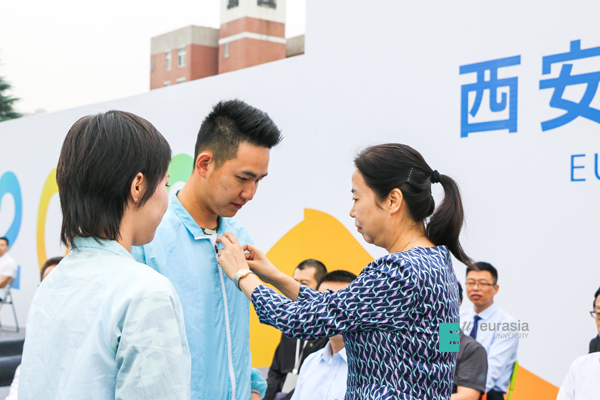 (图五)校长刘瑾教授为新生代表佩戴校徽