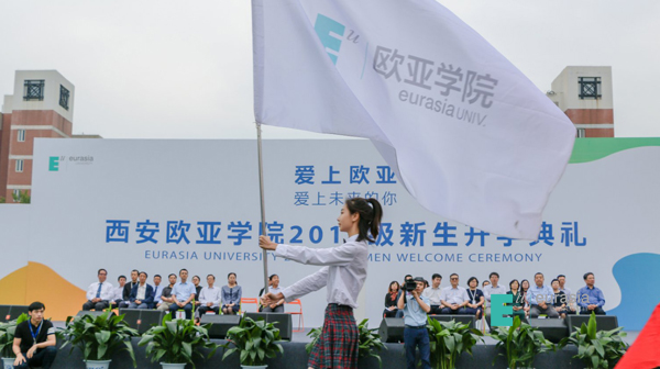 首先,校旗从同学们的头上缓缓飘过,让新生们感受到欧亚温暖的怀抱,以此欢迎每一位新生的到来。伴随着开场的钟声,典礼正式开始。国旗、校旗、分院号旗、社区号旗纷纷入场。典礼在庄严的国歌声中拉开帷幕。