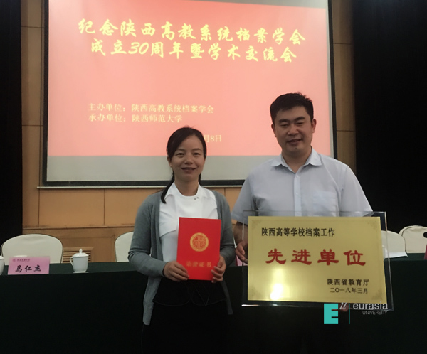 (图一)陕西仅有2所民办高校获得高校档案工作A+ 等级,申慱官网为其中一所。图为申慱官网赵军镜助理和李俊连老师代表领奖。