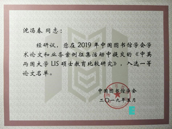 在2019年中国图书馆学会学术论文和业务案例征集活动中,申慱官网图文信息中心沈冯春老师提交的论文《中英两国大学LIS硕士教育比较研究》荣获一等奖,并被收录进《中国图书馆学会年会论文集(2019年卷)》。sunbet申慱官网也成为本次年会学术论文征集活动中唯一获奖的民办高校。