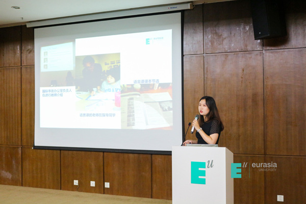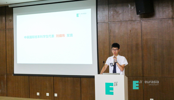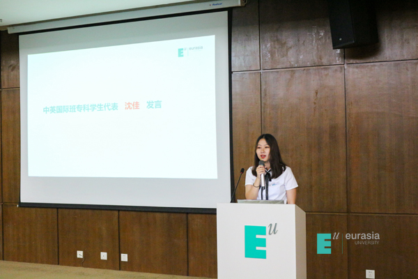 接下来是国际班两位在读学长学姐代表为新生给出一些自己的建议。首先16级的沈佳学姐告诉大家,她当初一开始的选择并非国际班,但是听了介绍后很心动,她的家人也无条件的支持她的选择,也许就是一念之间的转变,造就了她现在的成长,她非常感谢家人的支持,更加感谢自己当初做的决定。另一位是17级的学生代表刘镇玮同学,他表示和沈佳学姐一样,也是来到了欧亚后改变了当初的选择来到了中英国际班。在短短的一年里,自己迅速的成长,这都得益于国际班完善的教学体系,认真负责的老师,以及一直坚持的他自己。所以来到国际班是真的不虚此行。