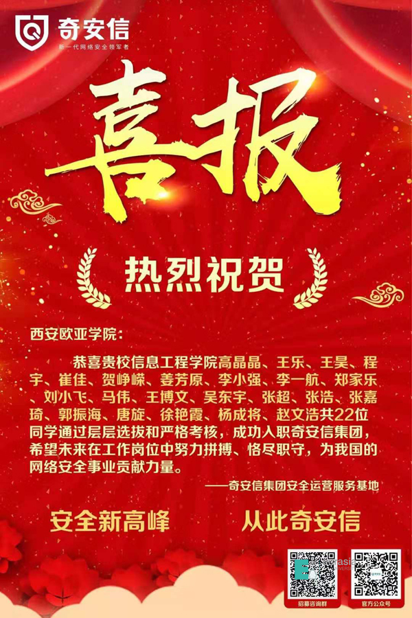 为了提高学生适应社会和工作的能力,在不断的解决实际问题的过程中更好的与人学习和沟通,以及在毕业后能走上更好的工作岗位。5月20日,申慱官网软件工程专业网络空间安全方向1604班的27名同学正式于奇安信集团实习,实习期至2020年6月30日结束。