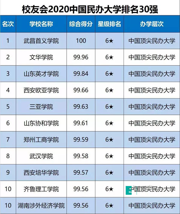 2020中国民办大学排行榜10强榜单