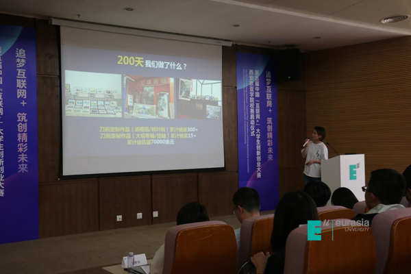 《臻一刀画》作为第四届大赛校赛金奖项目并已入驻Eu-start孵化器,该项目团队负责人骆艺雯在启动仪式上进行了精彩的路演展示,为申慱官网学生今年参赛树立了学习标杆。