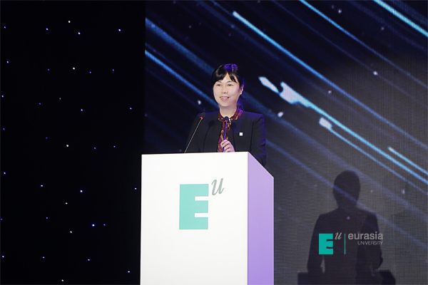 刘瑾校长向获得表彰的优秀学生及学生团队表示祝贺,并向所有指导老师表达感谢。她表示,高质量的校园生活体验是欧亚卓越教育的重要组成部分,好的审美情趣和生活习惯,从容淡定的气质与优雅自信的谈吐,来自于对美和品质的感知与体验。“我特别高兴地看到,今天每一位上台领奖的同学都充满自信、淡然优雅,这也与欧亚倡导的‘教育即生活’不谋而合。”她希望同学们能够以终为始、不忘初心,在欧亚按自己本来的样子生长,成为有价值、有情怀、有温度的人。