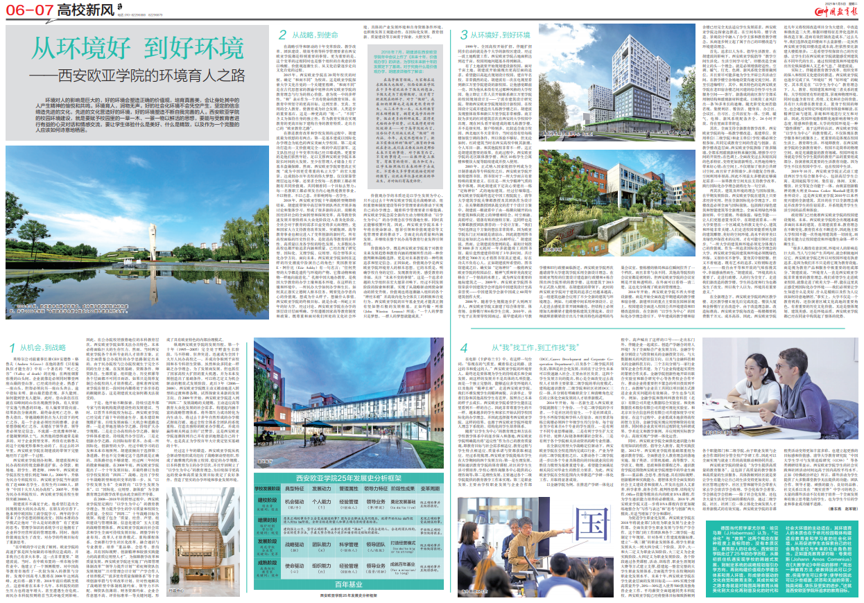 《中国教育报》2021年1月5日刊发的《从环境好,到好环境》一文,从战略选择与实施、校园环境建设服务教育教学改革等角度报道了申慱官网的环境育人之路。文章指出,回顾sunbet申慱官网走过的25年办学历程,从最初抓住机遇实现学校的跨越式发展,到制定系统的战略规划指引办学方向,再到构建价值观办学理念体系和育人环境,形成使命驱动的文化自觉和教育主张,其成长蜕变之路本身就是对我国高等教育从精英化到大众化再到普及化的时代和社会大环境的主动适应,其环境育人的本质也在于依托校园载体构建适应教育者和学习者的社会化环境,从而促进学生去探索自己的社会角色定位与未来的社会角色担当。