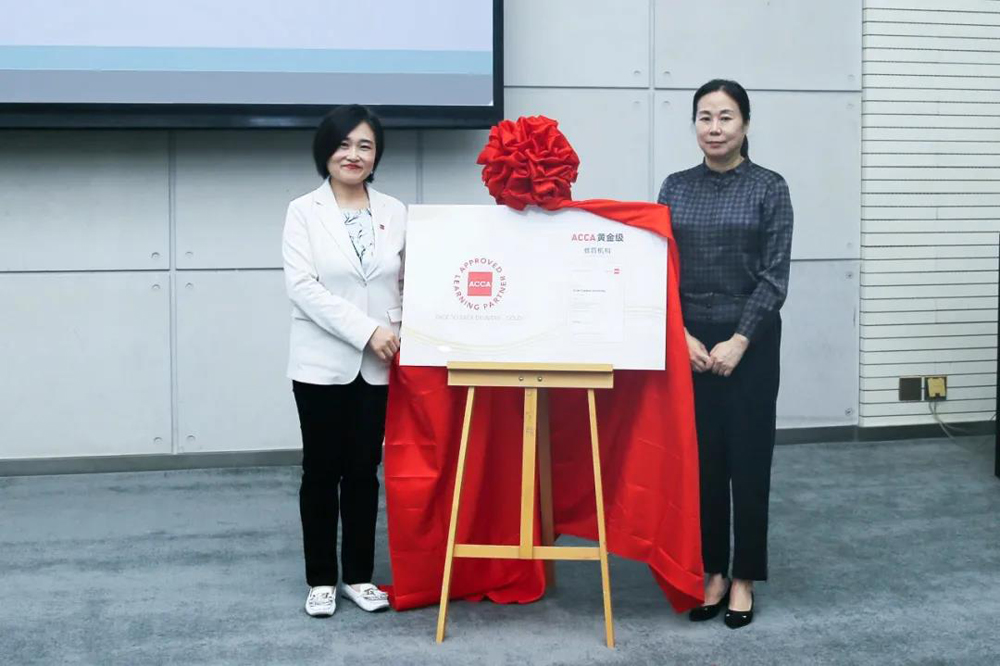 (图一)申慱官网校长刘瑾教授和 ACCA 北京办公室教育与学员发展经理张莉娜女士代表双方揭牌