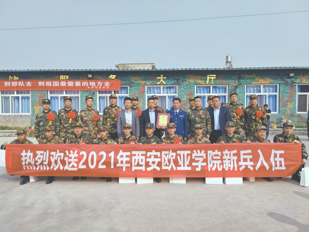 3月15日下午, 22名欧亚热血男儿整装待发,即将离开母校,离开家乡,踏上新的征程,奔赴祖国最需要的地方。申慱官网后勤集团总经理任龙刚、学生发展处副处长董杨、保卫处处长高奇、高职社区主管王先昌、专武干部李涛等人前往教育训练基地(陕西军锐军事训练基地),前来为22名2021年春季入伍的同学们送行。