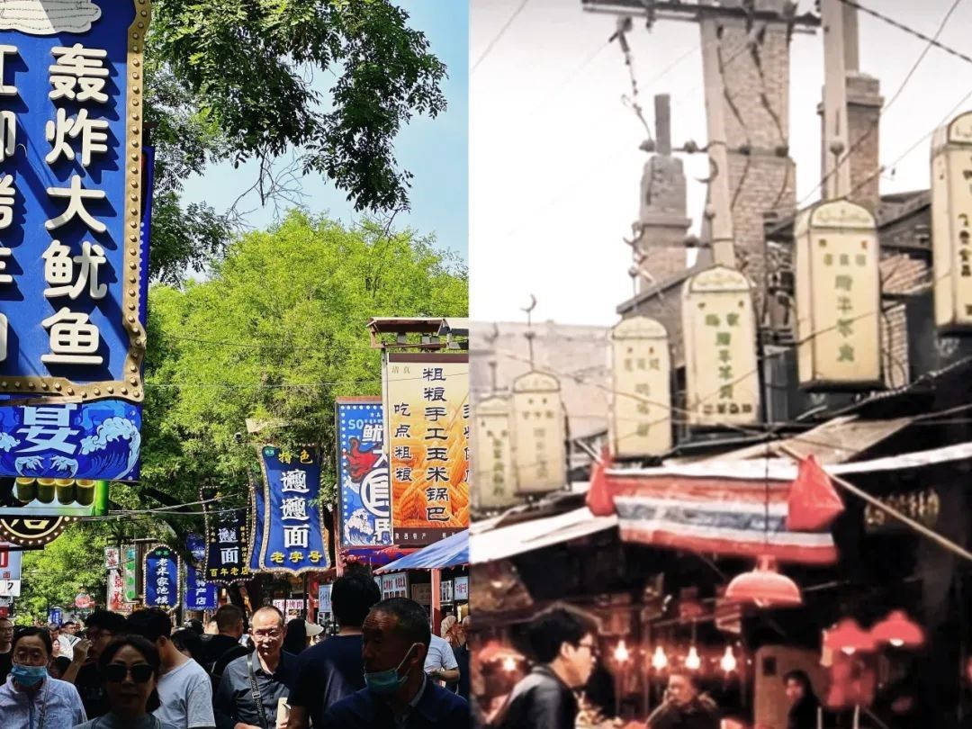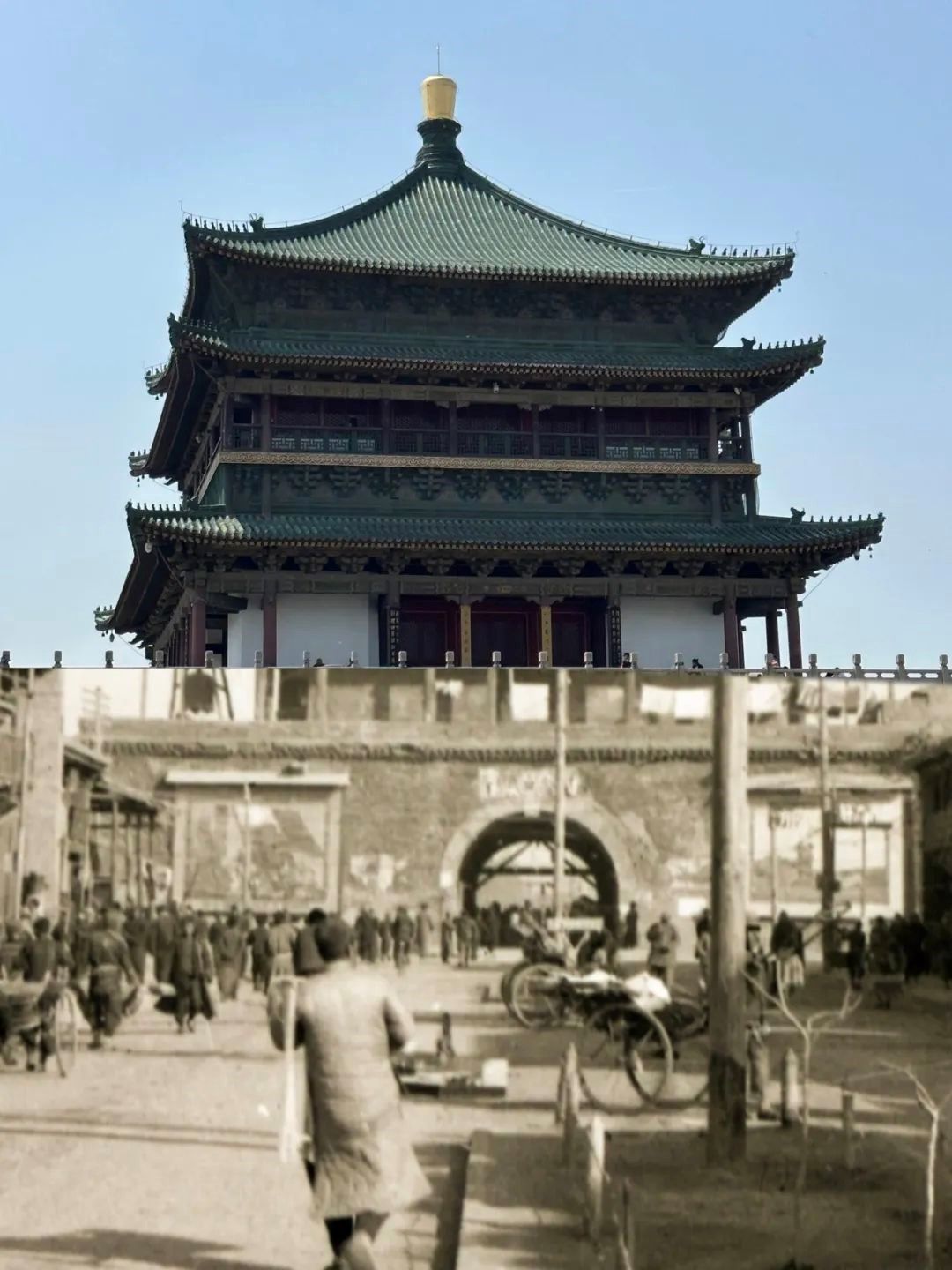 作者阐述:通过寻找西安城内的标志性建筑及景点,例如,城墙、回民街、钟楼等,进行古今对比。一边溯源着历史的古建筑,一边发展着迈向世界的商务区,利用老照片进行对比拍摄、拼接,展现新时代新西安的繁荣与富强。